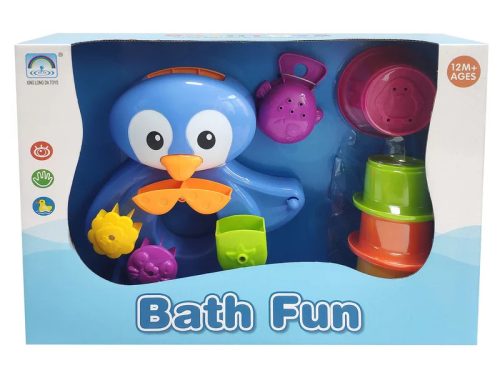 A Lubickoló pingvin műanyagból készült, megtapad a csempén vagy a fürdőkád falán is! A vödrökkel öntsd be a fején a vizet, ami vagy a malomkerekekre, vagy a tartályba fog folyni. A pingvin nyakkendője billeg, a pingvin és a vödrök tengeri állatokkal vannak díszítve. A Lubickoló pingvin fürdőjáték segít megérteni az ok-okozati összefüggéseket